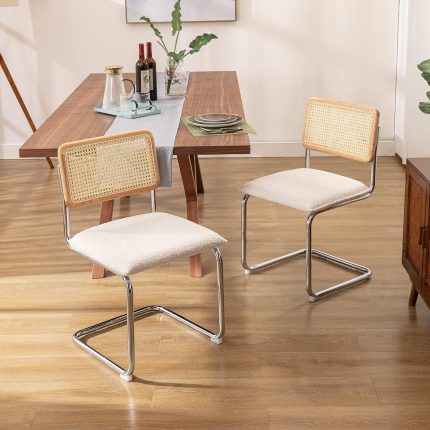 Mid Century Modern Dining Chairs Set of 2, Upholstered Kitchen Chairs, Designed Chairs, Armless Accent Chairs with Natural Cane Back & Stainless Chrome Base