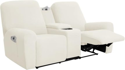 Stretch Recliner Loveseat Cover with Center Console Sofa Slipcover Soft Fitted Fleece 2 Seats Couch with Holder and Storage Washable Furniture Protector Beige