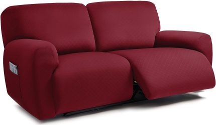Squared Jacquard Design Extra Wide 75″ – 100″, Reclining 2 Seater Sofa, Extra Wide 6-Piece Reclining LoveSeat Slipcover, Reclining Sofa Covers, Thick, Soft, Washable (Burgundy – Wine)