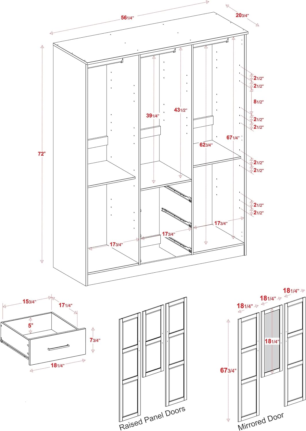 - Overall Size: 56.25″w x 72″h x 20.75″d