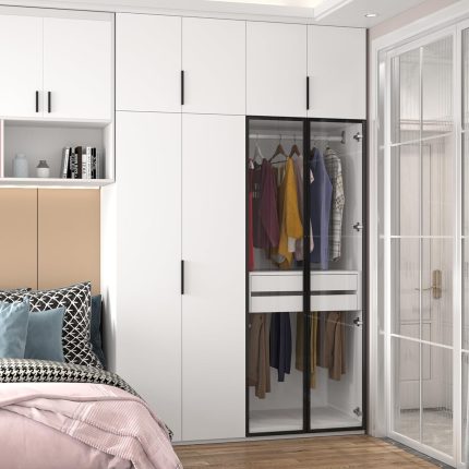 - Includes 3 doors on soft‐closing metal Euro concealed hinges, 2 shelves and 3 clothing rods with metal supports (optional additional shelves sold srately)