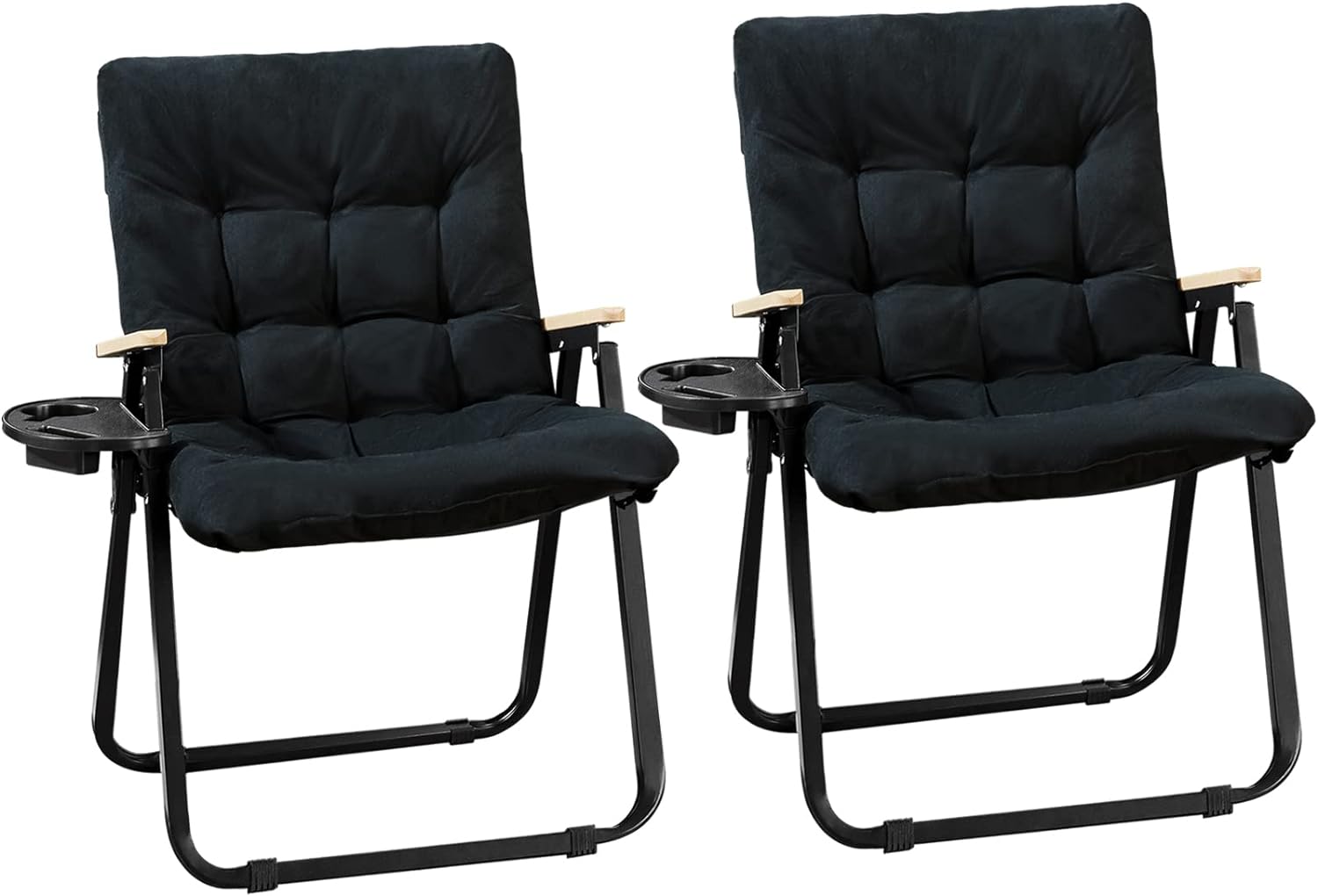 Home Folding Chair 2 Pack Folding Camping Chairs – Portable Camp Chairs with Cushion and Cup Holder, Folding Lawn Chairs for Adults, Heavy Duty Folding Chairs for Outside Camping Hiking Fishing Beach, Black
