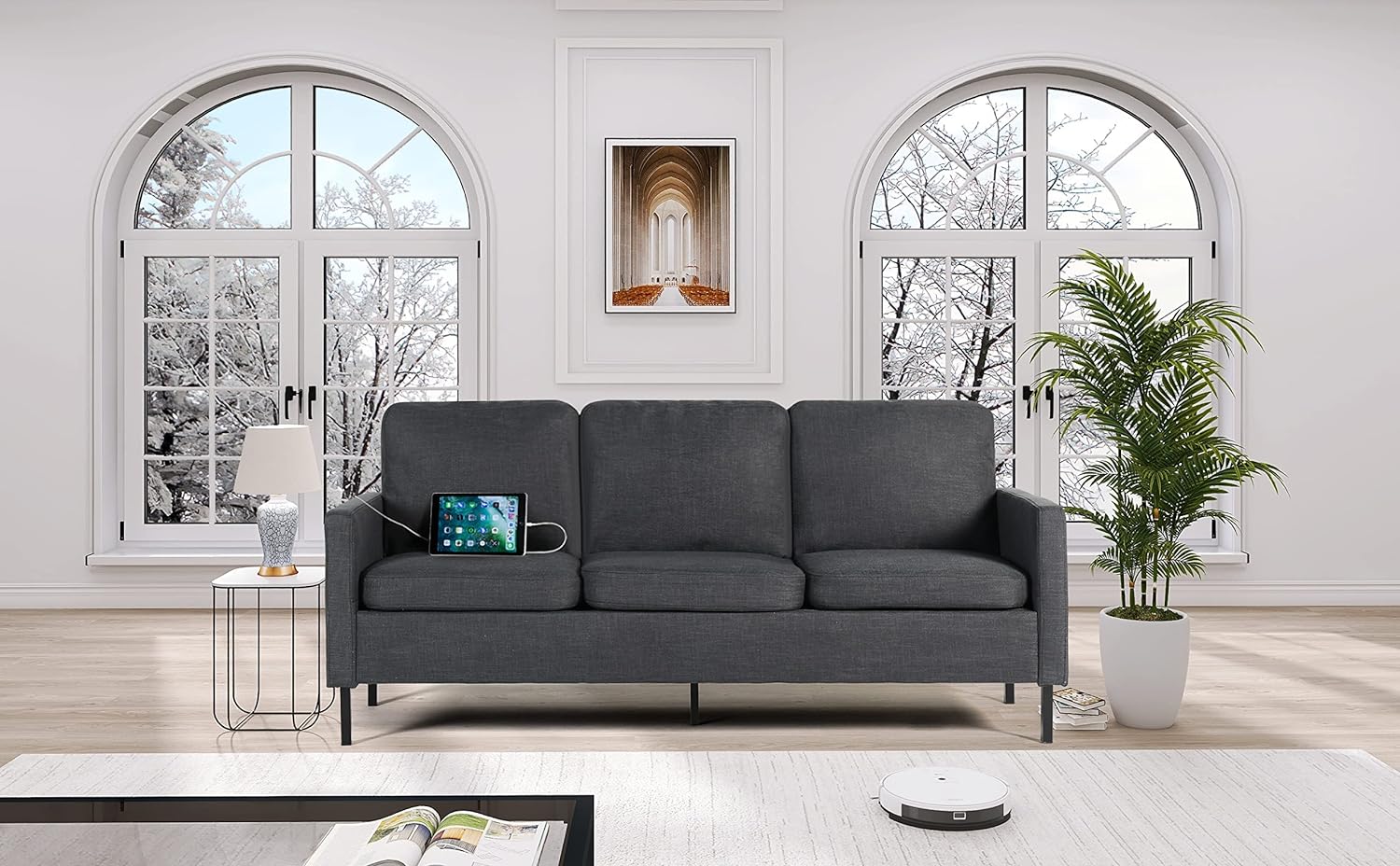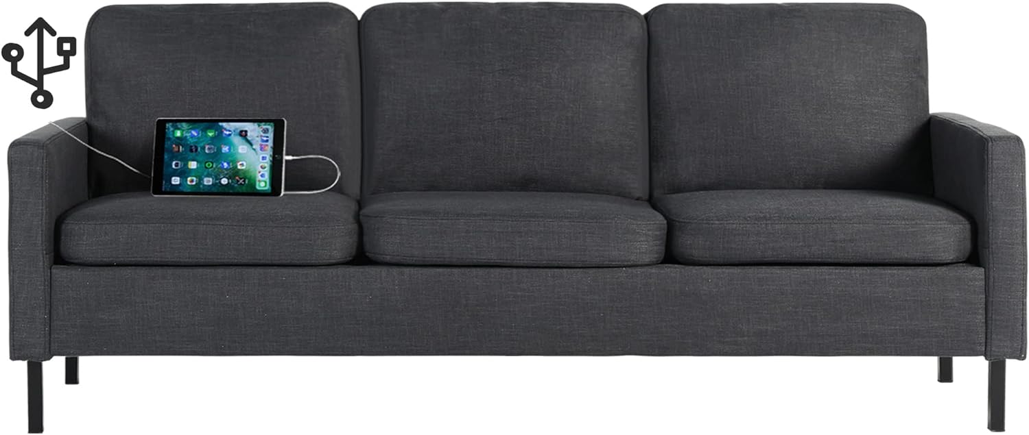 Home Sofa Three-seat Sofa 72″ W Fabric 3 Seater Couch with 2 USB, Comfortable Sectional Couches and Sofas for Living Room Bedroom Office Small Space, Easy Assembly & Comfy Cushion (72″ 3-Seater Sofa, Dark Grey)