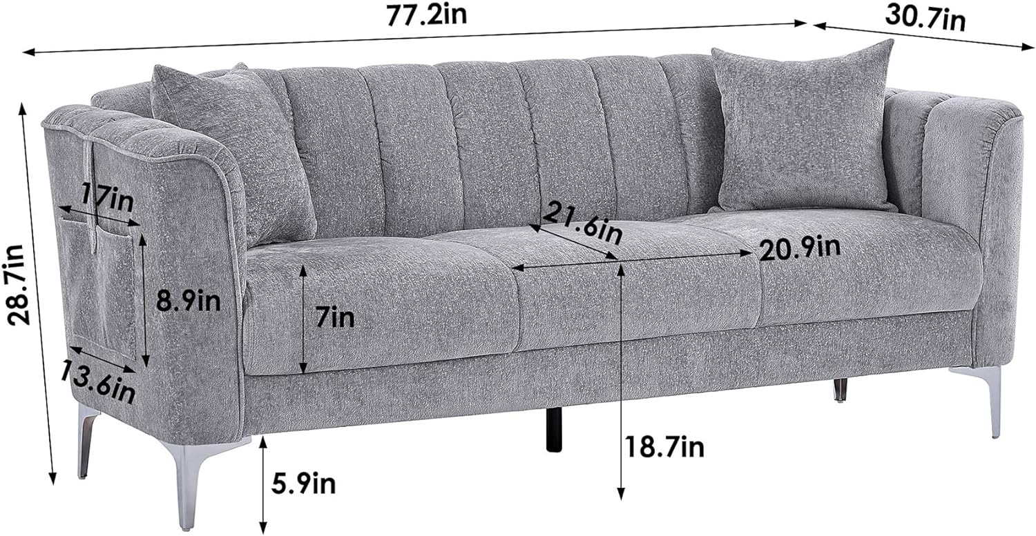 Home Sofa Three-seat Sofa 77″ Sofa, Modern Sofa Couch with Deep Seats, Comfy 3 Seater Sofa with 2 Throw Pillow and Pockets, Chenille Upholstered Sofa for Bedroom, Living Room, Office, Grey