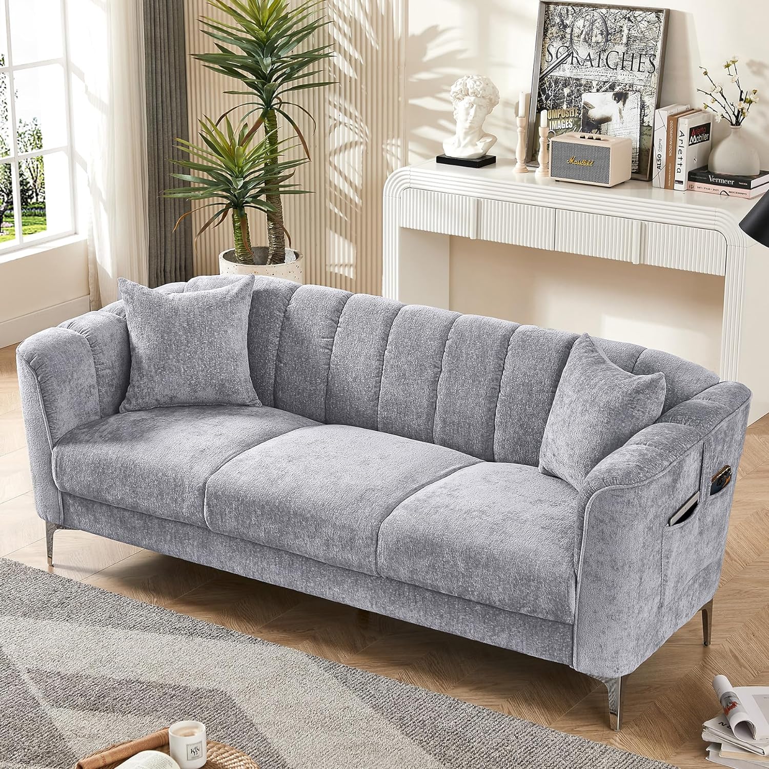 77″ Sofa, Modern Sofa Couch with Deep Seats, Comfy 3 Seater Sofa with 2 Throw Pillow and Pockets, Chenille Upholstered Sofa for Bedroom, Living Room, Office, Grey
