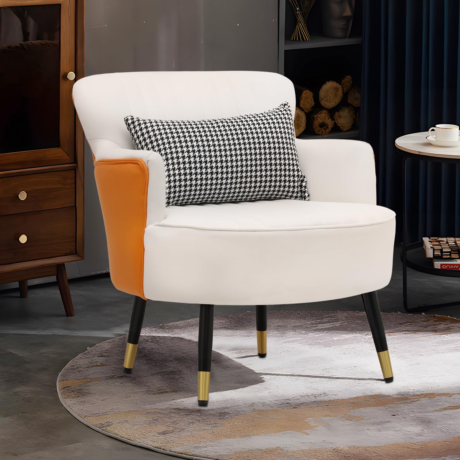 Accent Armchair Single Sofa Chair with Lumbar Pillow, White/Orange Contrasting Colors Upholstered Bedroom Reading Chair, Mid Century Modern Armchair for Living Room Bedroom