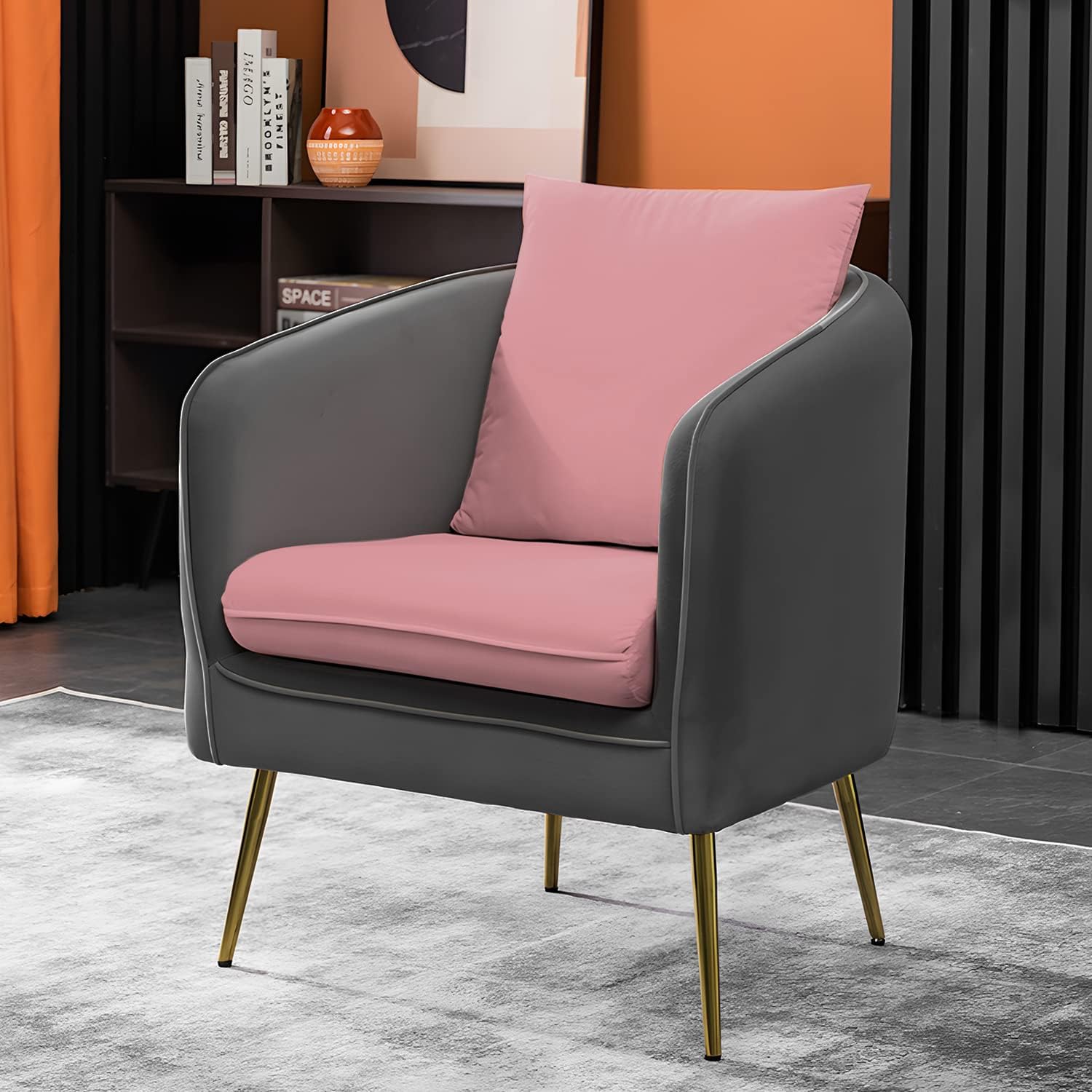 Accent Chair Upholstered Barrel Armchair, Suede Sofa Chairs for Bedroom, Living Room, Mid Century Modern Comfy Reading Chair with Metal Legs, Pink/Gray Contrasting Colors Tub Round Chair