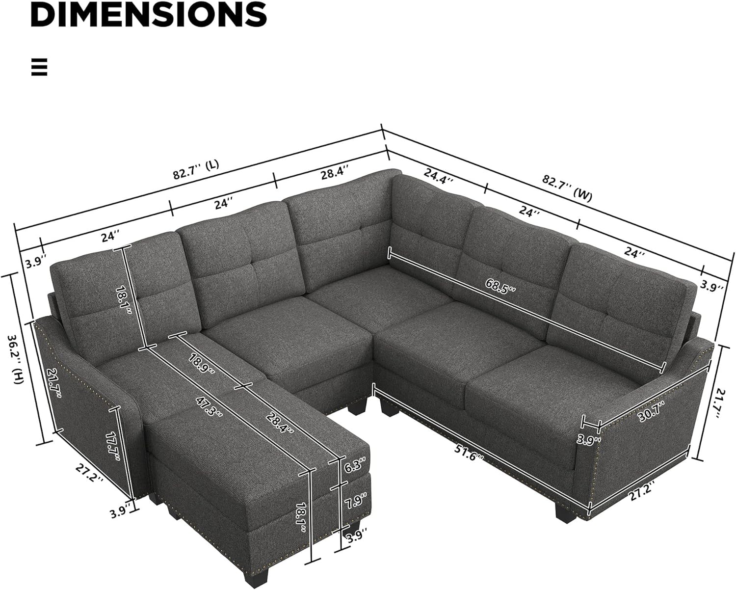 L-Shaped Sectional Sofa with Chaise Lounge, Convertible Ottoman, 7-Seater Modern Linen Fabric Oversized Couches Home Furniture Sets for Living Room, Apartment, Office, Dark Grey