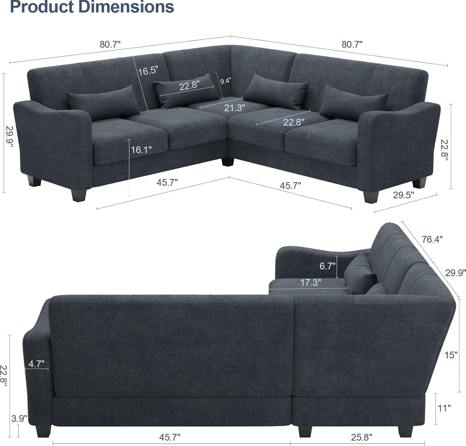 • CORNER COUCH DIMENSIONS: Overall dimensions of this L Shape Sofa is 78.7″(L)*78.7″(W)*29.5″(H) and Pillows 19.7″(L)*9.1:(W). Perfect cozy sofa choice for an apartment, studio, condo, living room or bedroom