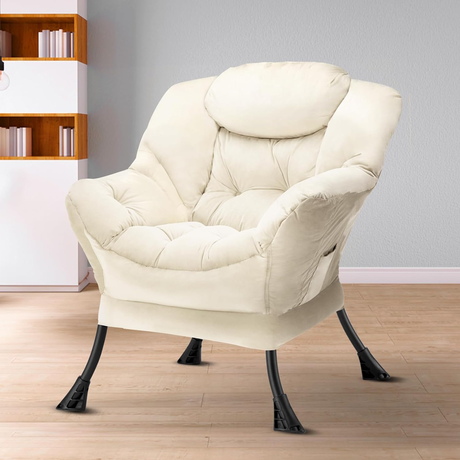 Fabric Lazy Chair Large Accent Chair,Velvet Modern Lounge Reading Chair with Armrests & Side Pocket,Upholstered Armchair for Living Room,Bedroom,Dorm,Beige