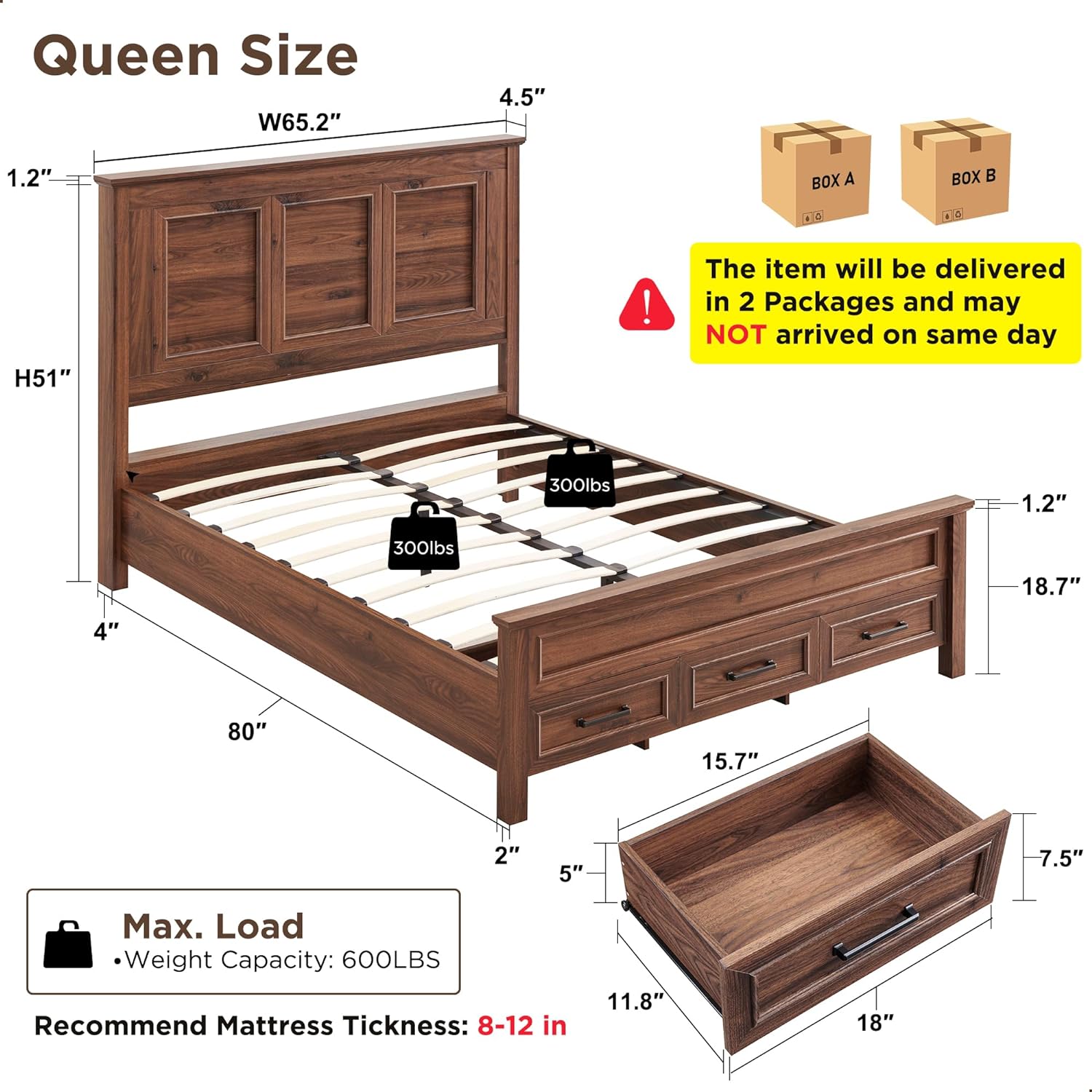 Farmhouse Queen Size Bed Frame with 52″ Tall Full-Panel Headboard, Wood Platform Bedframe with Footboard and Storage Drawers, No Squeak, No Box Spring Needed, Brown