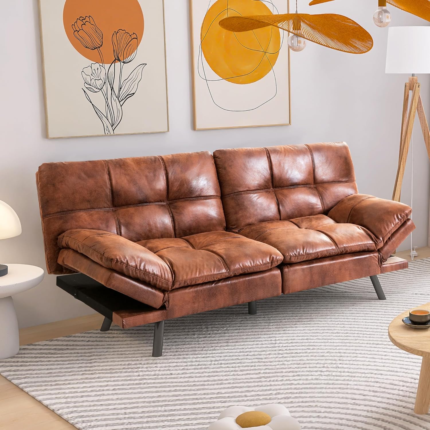 Couch Futon Sofa Bed, Memory Foam Futon Sleeper Sofa Loveseat Convertible Couch Bed for Small Compact Living Spaces,Apartment,Brown Faux Leather