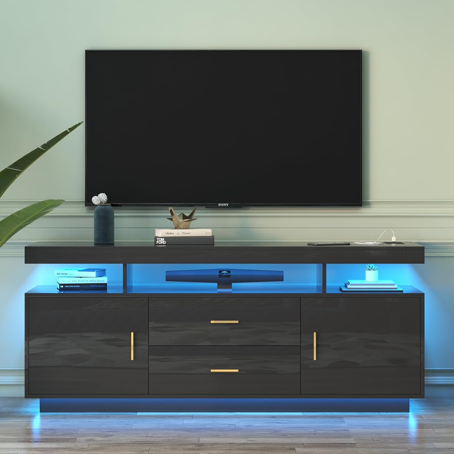 • ? 【High Gloss Entertainment Center】Size: 59”L x 15.7″W x 25″H. It can accommodate TVs below 75 inches. Perfect for living room, dining room, hallway. It can be a TV cabinet, a side cabinet or even a storage locker.