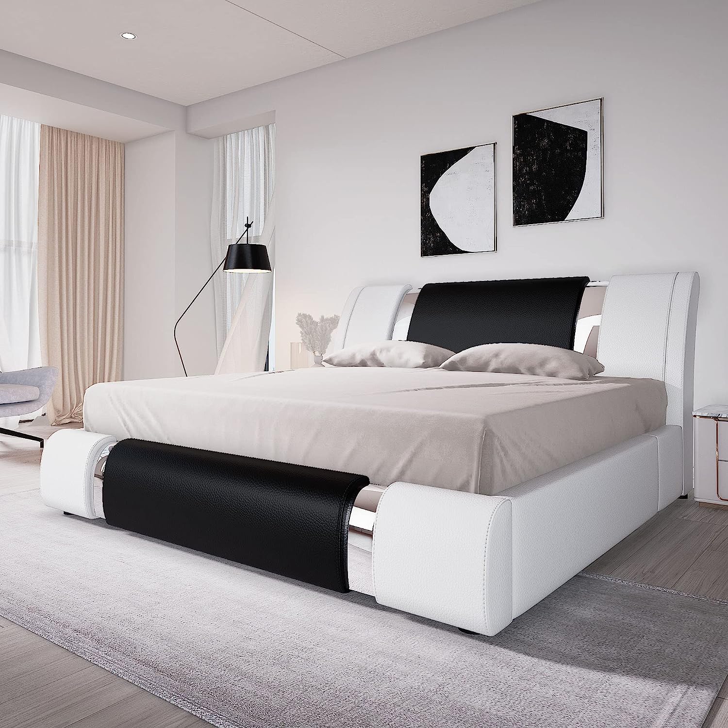 • Modern Style: Using typical white and black colors, and decorated with sparkling metal pieces, this bed frame will be the most eye-catching centerpiece in your bedroom.