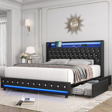 Full LED Bed Frame with Charging Station and 4 Storage Drawers, PU Upholstered Platform Bed with Handcrafted Crystal Button Wingback Headboard, Metal Frame with No Box Spring Needed, Black