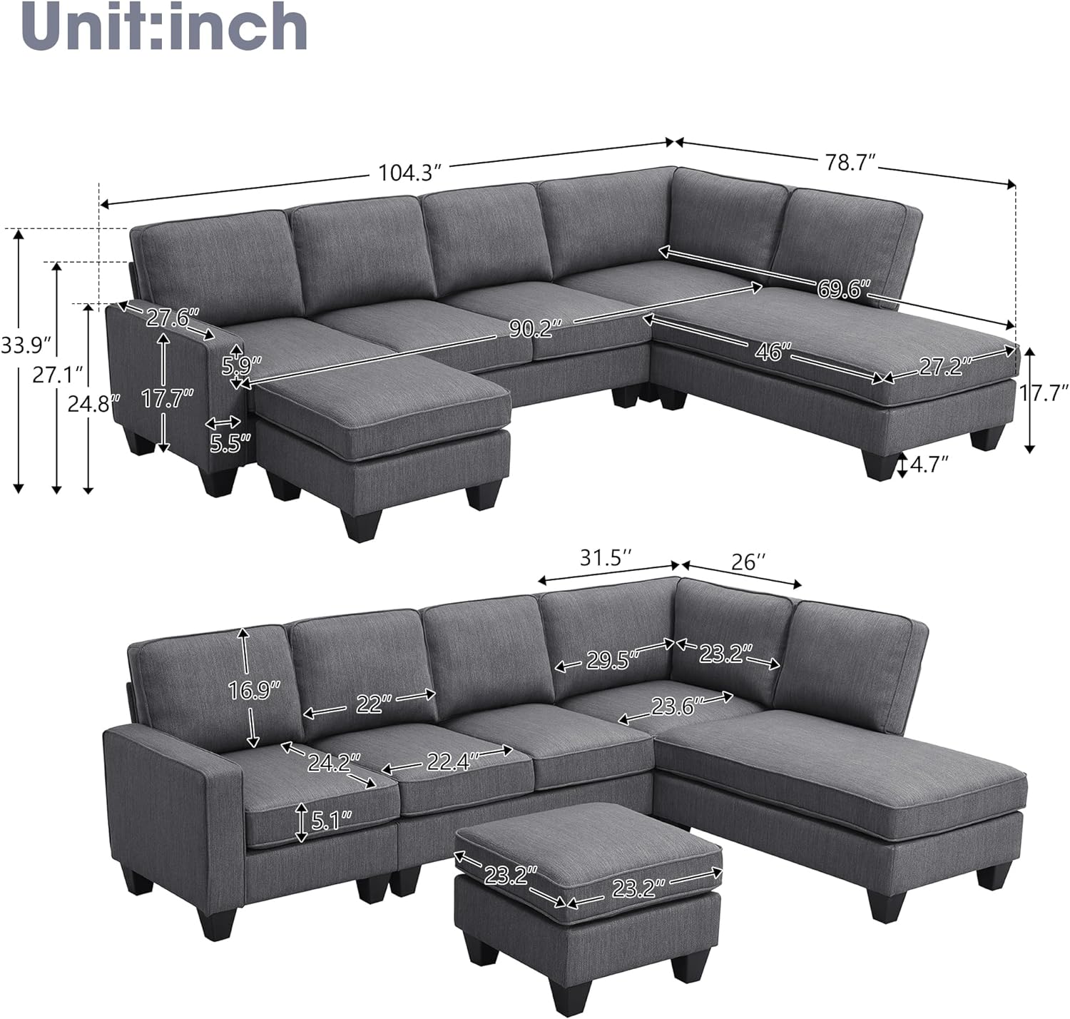 Home Sofa Corner Sofa L-Shaped Sectional Sofa with Chaise Lounge, Convertible Ottoman, 7-Seater Modern Linen Fabric Oversized Couches Home Furniture Sets for Living Room, Apartment, Office, Dark Grey