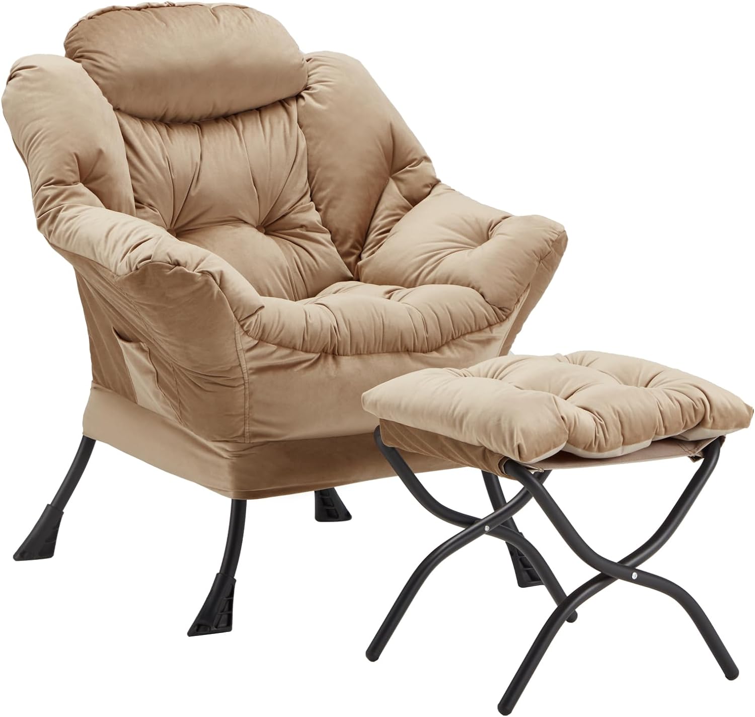 • ?Quality Assurance: Our lounge chair for bedroom uses a sturdy bent H-shaped metal rust-proof frame, with a weight capacity of up to 330lbs. There is a crossbar in the middle for further reinforcement, ensuring the stability of reading chair during use. Both the chair and footstool have anti-slip pad designs, preventing floor scratches on top of anti-slip features. This lazy chair sofa is also made of high-quality velvet fabric with neat stitching that won’t fade with prolonged use.