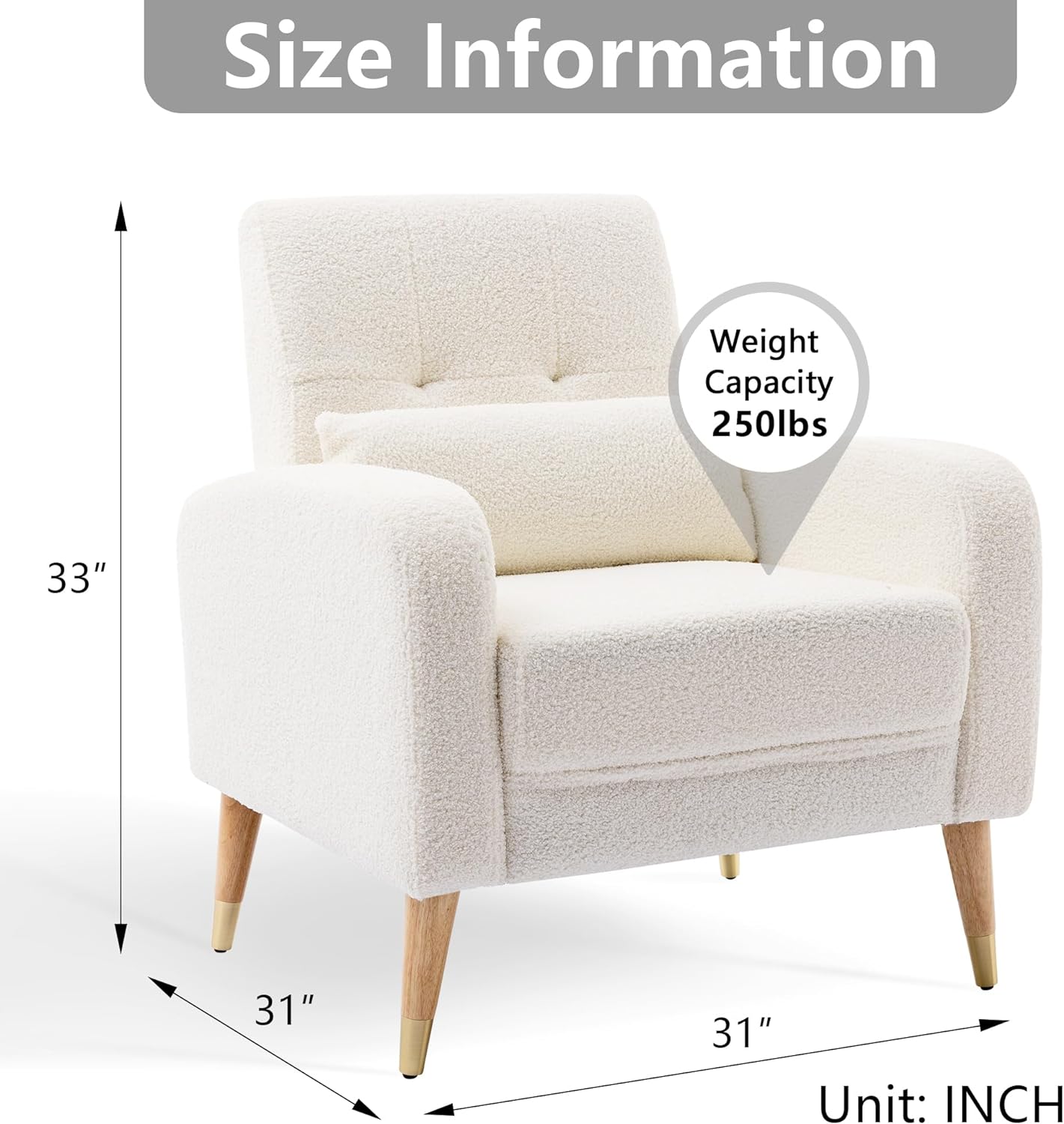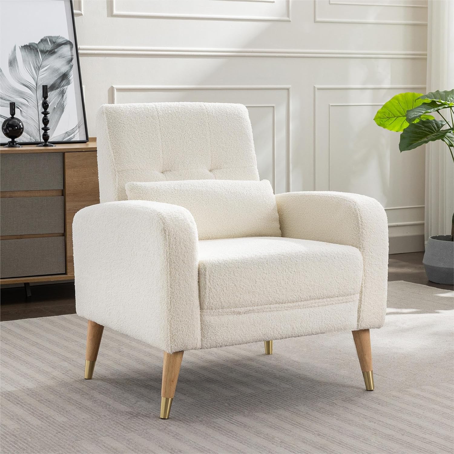 Home Sofa Chair Mid-Century Modern Accent Chair, Upholstered Armchair Living Room Chair, Comfy Single Sofa Chair with Sturdy Legs, Polyester Fabric Chair for Living Room Bedroom, White