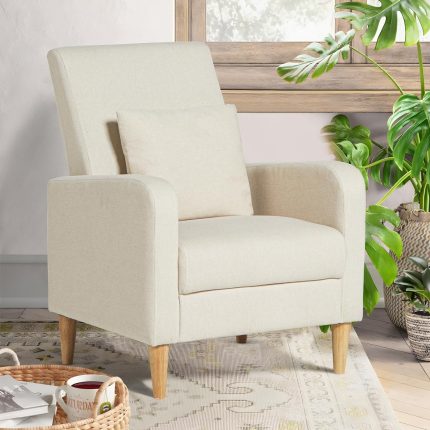 Modern Wingback Living Room Chair, Upholstered Fabric Accent Armchair with Pillow, Single Sofa Chair with Lounge Seat and Wood Legs for Bedroom/Office/Reading Spaces, Cream