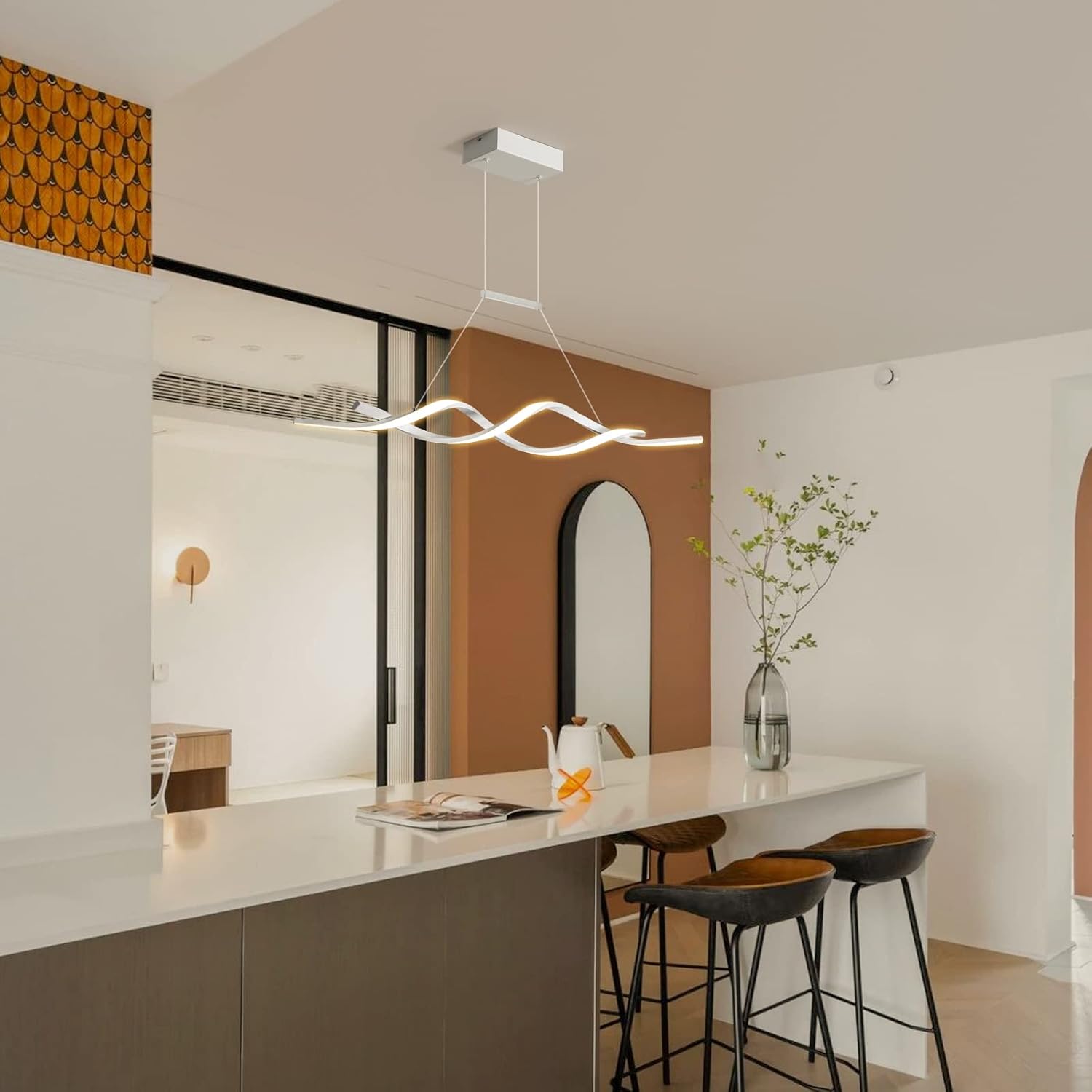 Home lamp Chandelier Modern Pendant Light, Dimmable LED Chandelier with Remote Control, Wave Shape Chandelier Lighting, Chandeliers for Dining Rooms Kitchen Island Restaurant Living Room, 3000-6000K, 28W, White
