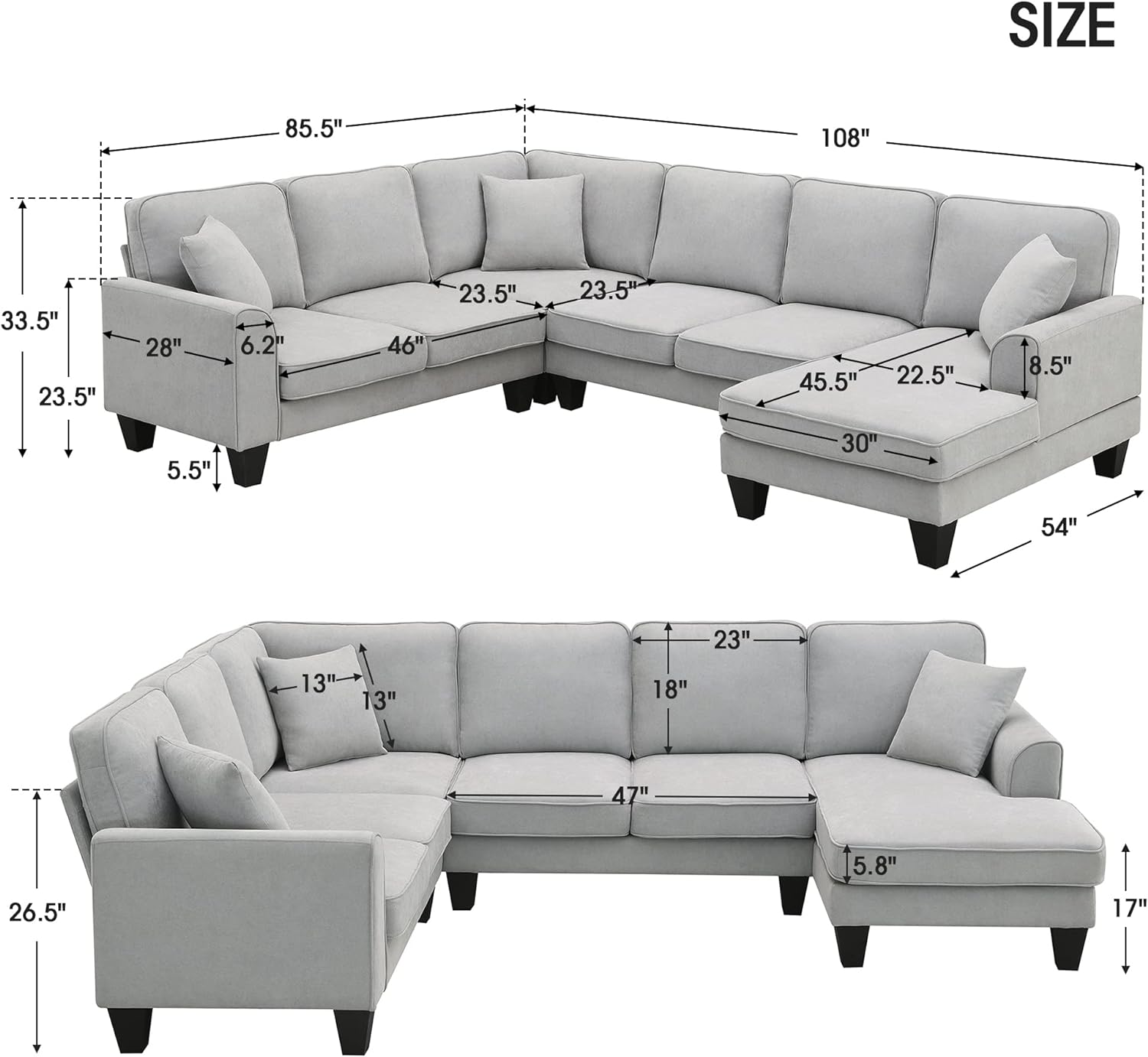 • 【Dimension and Assemble】Modern u shape sectional sofa Overall dimension:108”W x 85.5”D x 33.5”H; Weight Capacity: 330lbs/seat.Loveseat dimensions:47″L*23.5″D, Chaise dimensions:45.5″L*30″D, Sofa dimensions:70″L*23.5″D,Assemble is required with tools and clear instruction included.