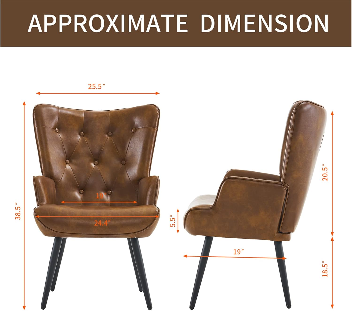 - [Premium PU Leather]-Upholstered in high quality PU leather with elegant button-tufted design, the accent chair makes for a retro flair. Durable and easy to clean, only just wipe the dust on the arm chair with a damp tissue. Exquisite PU leather and yellowbrown color are perfect accent to any room style.