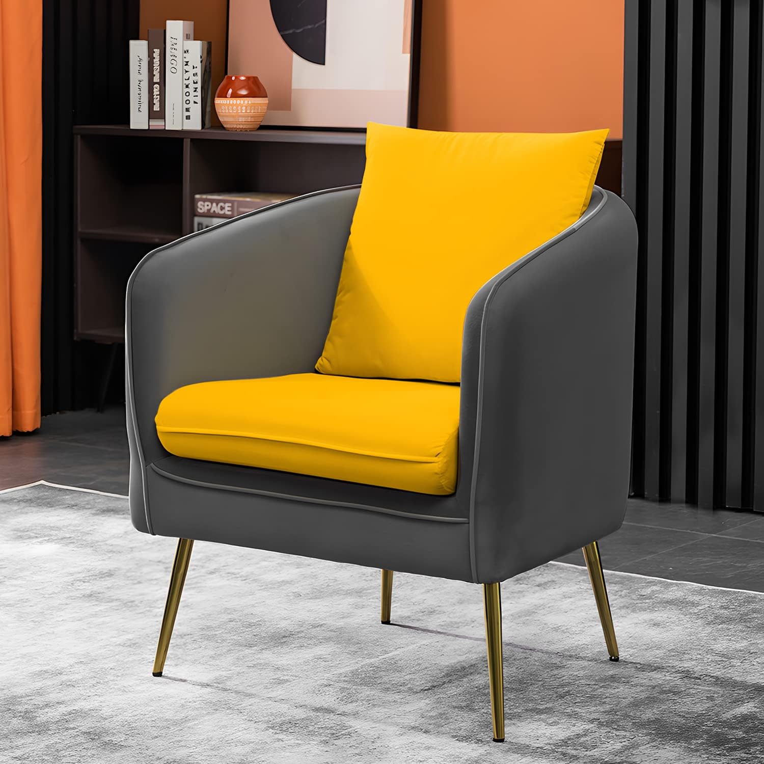 Home Sofa Chair Sofa Chair Arm Chair Living Room Bedroom Reading Chair, Yellow/Gray Contrasting Colors Upholstered Bedroom Barrel Chair with Backrest Pillow, Mid Century Modern Comfy Suede Singel Armchair