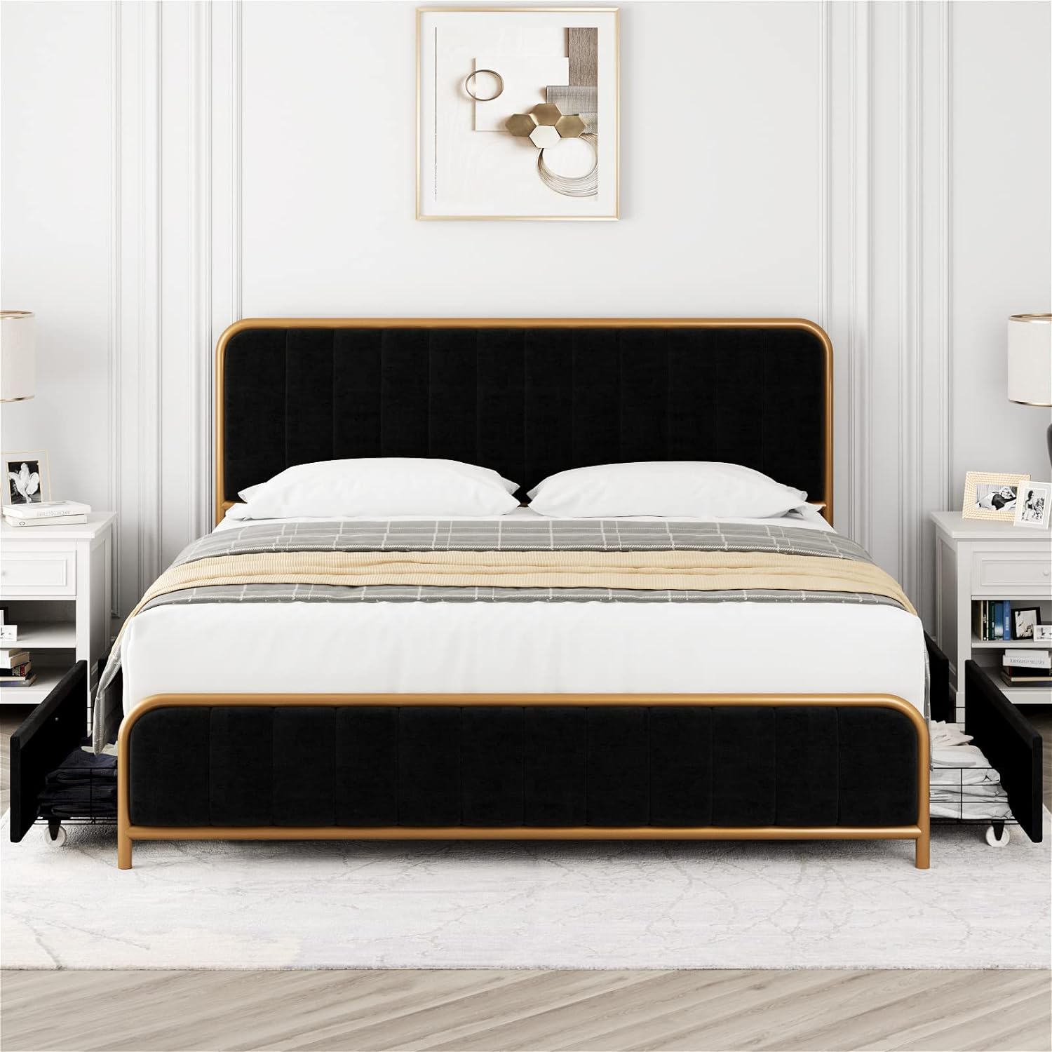 Upholstered Queen Size Bed Frame with 4 Storage Drawers and Headboard, Heavy Duty Metal Mattress Foundation with Wooden Slats, Easy Assembly, No Box Spring Needed (Golden/Black, Queen)