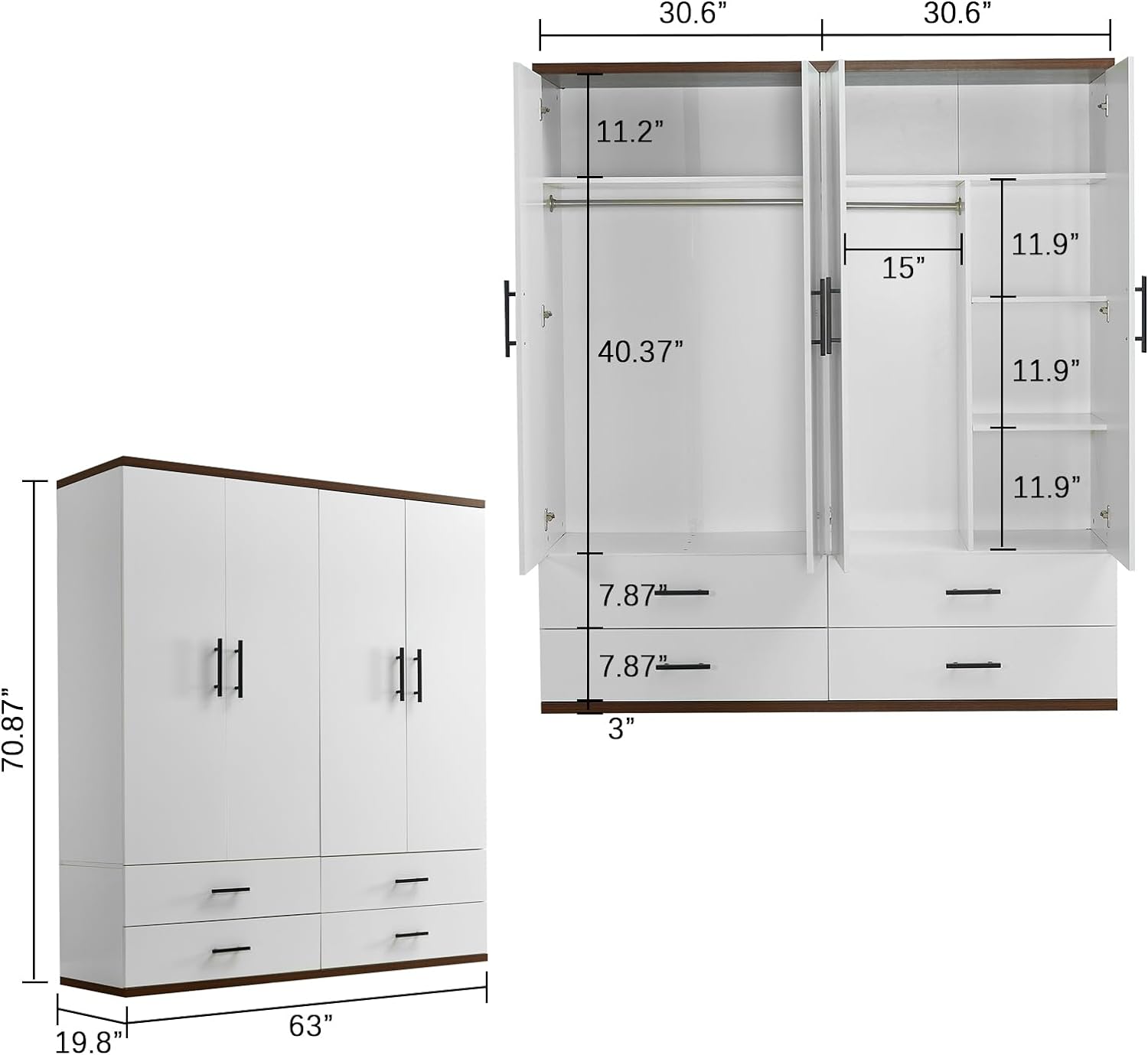 Wooden Armoire Wardrobe Closet with 4 Doors 4 Drawers 2 Hanging Rods for Bedroom 71″ Tall Large Freestanding Clothes Storage Cabinet and Shelves White 63”W x 18.9”D x 70.86”H